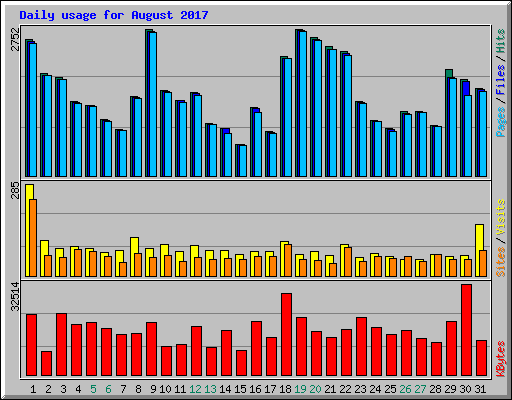 | Day | Hits | Files | Pages | Visits | Sites | KBytes | ||||||